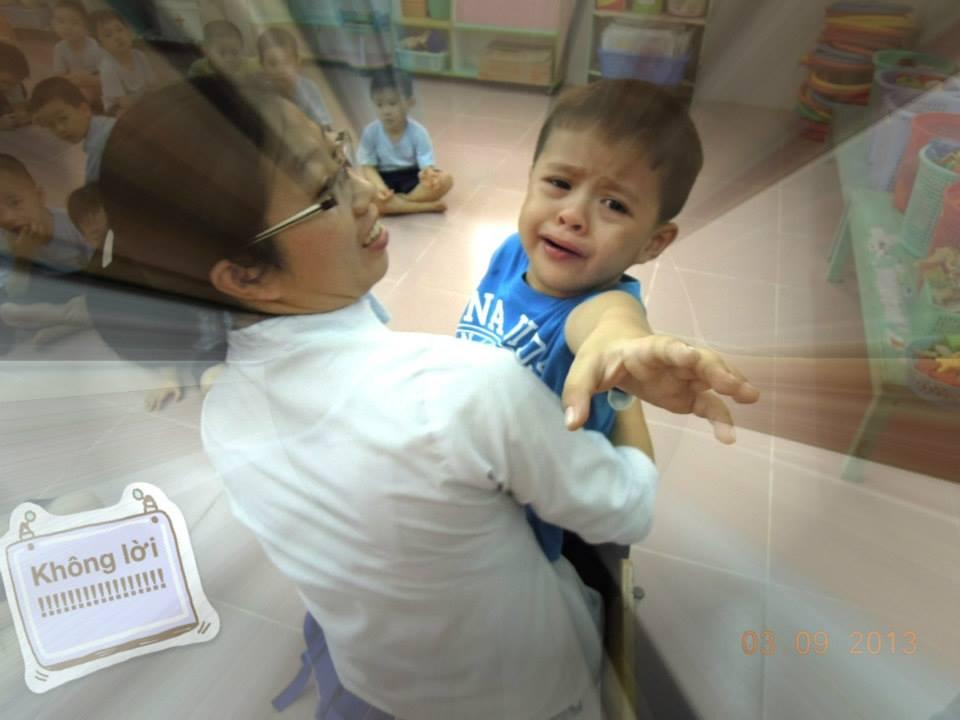 Cà phê được cô bế nhưng vẫn khóc chỉ tay về phía mẹ "Hôm nay con chuyển qua học ở